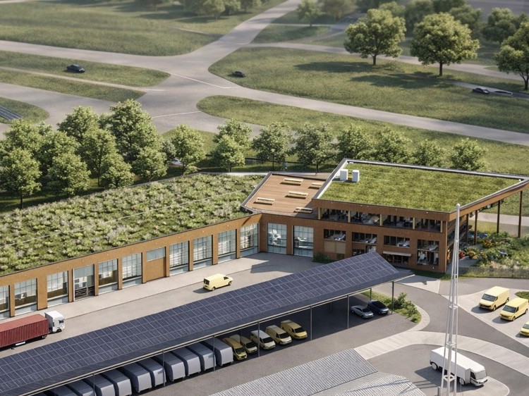 Ongeveer 50% van het dak wordt een retentiedak dat regenwater tijdelijk vasthoudt in kratten onder het sedum (tot 125.000 liter). Dit verlaagt de piekbelasting op het riool en houdt water lokaal beschikbaar. Daarnaast plaatsen we twee RVS-tanks van elk 31.000 liter (met een tweede leven uit de voedselindustrie) voor opslag van gefilterd regenwater. Dit water gebruiken we voor het wassen van vrachtwagens, waarmee we gemiddeld 2.000 liter drinkwater per dag besparen.